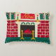 Image printed on rectangle pillow is from a photo of an original tapestry crochet creation designed handmade and Copyright © by published designer Delores Chamblin. The picture of the unique handcrafted brick fireplace red gold green and white Christmas wall hanging is reproduced on the holiday decor.