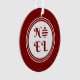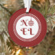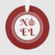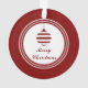Round Christmas ornament with a red and white Christmas fun NOEL text print and a striped Christmas bauble design on the front and a with a red and white Christmas bauble and MERRY CHRISTMAS text print on the back side.