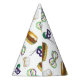 Party hat features an original marker illustration of Mardi Gras and New Orleans themed designs, with LAISSEZ LES BON TEMPS ROULER in a purple font. Great for any Mardi Gras themed party or celebration!