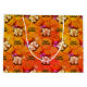 Attractive patron in warm tones such as coffee, orange and ochre where a nomo and its halloween broom stand out to wish a happy halloween
