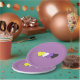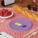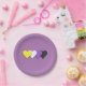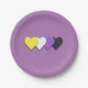 Paper plates with hearts in colours of non-binary pride flag, enby pride design on purple background; yellow, white, purple, and black hearts