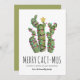Funny christmas holiday card featuring a cute cactus christmas tree wrapped in string lights, topped with a gold star, the humorous seasons greetings 'MERRY CACT-MUS', your wishes, and family name.