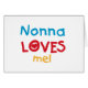 Nonna Loves Me T-shirts, bodysuits, cards, bags, and other gear with a blue, red, and yellow text design.