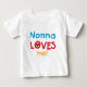 Nonna Loves Me T-shirts, bodysuits, cards, bags, and other gear with a blue, red, and yellow text design.