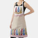 This Scandinavian inspired apron design features a two Nordic Gnomes wearing red, blue and greenfair isle attire with text that reads "Lefse Rolling Team" on a rolling pink The border around the bottom has a coordinating fair isle pattern with a row of gnomes.