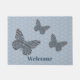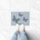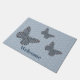 The wings and body of a monarch butterfly are decorated with designs inspired by patterns on sweaters found in the Nordic countries of Norway, Sweden, and Finland, with motifs like snowflakes, mountains, and evergreen trees in white, blue, green, and grey with bright red accents. Customise the text on this door mat to create a personalised decoration for your entryway.