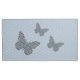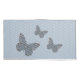 The wings and body of a monarch butterfly are decorated with designs inspired by patterns on sweaters found in the Nordic countries of Norway, Sweden, and Finland, with motifs like snowflakes, mountains, and evergreen trees in white, blue, green, and grey with bright red accents.