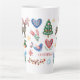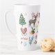 Here is a pretty Christmas theme latte mug that is covered with scandinavian style images, including a reindeer, pattern hearts, a Holiday tree, flowers, snowflakes, and more. Colours include red, green, gold, blue and brown. Everything is placed on a white background. Unique, colourful, and festive!