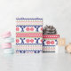 The repeated pattern on this colorful Christmas Nordic sweater style gift wrapping paper is a silhouette cheerleader with poms among snowflakes, trees, and geometric designs. Colors include navy blue, bright Holiday green, and red, all on a white background. Fun for anyone who loves cheer!