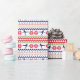 The repeated pattern on this colorful Christmas Nordic sweater style gift wrapping paper is a silhouette ice skater among snowflakes , trees, and geometric designs. Colors include navy blue, bright Holiday green, and red, all on a white background. Fun for anyone who loves to ice skate!