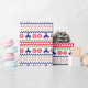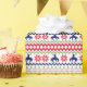 The repeated pattern on this colorful Christmas Nordic sweater style gift wrapping paper is a silhouette cowboy riding a bucking horse among snowflakes , trees, and geometric designs. Colors include navy blue, bright Holiday green, and red, all on a white background.