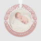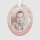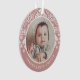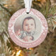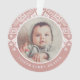 Festive Christmas photo ornament features a favourite photo on each side, encircled by a holiday sweater pattern in mauve pink and white. Personalise with your custom caption; shown with "baby's first Christmas" on one side and your little one's name and the year on the reverse. Perfect for treasured newborn photos or Christmas pictures of your sweet babe!