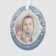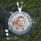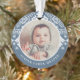 Festive Christmas photo ornament features a favourite photo on each side, encircled by a holiday sweater pattern in smoky blue and white. Personalise with your custom caption; shown with "baby's first Christmas" on one side and your little one's name and the year on the reverse. Perfect for treasured newborn photos or Christmas pictures of your sweet babe!