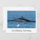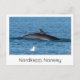 Common minke whale surfacing in the Arctic Ocean near Nordkapp / North Cape in Northern Norway with seagull on the foreground in August 2022