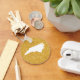 The shape of the state of North Carolina in white. Map shape in white against a photo of gold glitter. Faux golden glitter key chain.