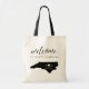 Welcome guests to your North Carolina wedding with these chic and modern personalised tote bags. Design features "welcome" in modern handwritten calligraphy script, with your initials joined by a heart, along with your wedding date, inside a black silhouette map of the state of North Carolina. Personalise with a specific North Carolina city or location name if desired.