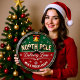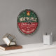 This fun, rustic clock features bold holiday typography in a green and red sign design, declaring the area the "NORTH POLE Delivery Zone" and reminding viewers that "MILK & COOKIES READY!" A large gold bell with a red bow sits at the top. The background mimics wooden planks painted in alternating green and red sections, accented with white snowflakes and holly. The design may look real due to the high detail and three-dimensional texture in the artwork.
