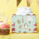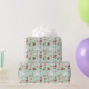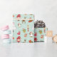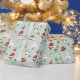 Wrapping paper with a potpourri of Christmas images such as the north pole sign; penguins with red hats; red and green, wrapped presents; reindeer; decorated, white Christmas trees with red caps; heart ornaments; beautiful red hats; and even a vintage Santa Claus in his jolly red suit and hat. All on a seafoam, light green background.