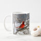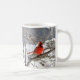 A beautiful northern cardinal perched in a snowy tree in winter.
