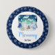 This cute and whimsical watercolor baby shower button features a watercolor winter wonderland scene with adorable arctic animals, such as a polar bear, penguin, cat, owl, seal and a moose. In the background are the northern lights, snow capped mountains and trees. The text combines handwritten script and sans serif fonts for a stylish and modern look. Falling snowflakes and beautiful blue floral arrangements give a winter feel. This is perfect for winter and Christmas baby showers.