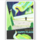 Original artwork of a the Northern Lights shining over a happy person and reflecting off of a dark lake. Sweet white birds and evergreens finish off the design. Text reads "this is my Happy Place". For all the adventurers out there!