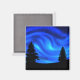 This digital artwork features a display of swirly blue lights in the night sky above the silhouettes of two evergreens.
