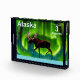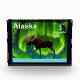 This is one of a series of postage stamps of a mythical independent Alaska. An ever so slightly stylised image of a moose silhouetted against the green and glowing Northern Lights. Text reading "Alaska" and "Postage 3 Nuggets" also appears.