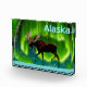 An ever so slightly stylised image of a moose silhouetted against the Northern Lights. Text reading "Alaska" appears in glowing blue and white.