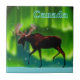 An ever so slightly stylised image of a moose silhouetted against the Northern Lights. Text reading "Canada" appears in glowing blue and white.