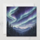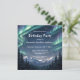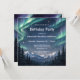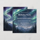 This captivating birthday celebration design features a breathtaking night sky illuminated by flowing northern lights in soft green and teal hues. Snow capped mountains rise in the distance above a dense evergreen forest, creating a dramatic alpine setting. Scattered stars add sparkle against the deep midnight blue background, enhancing the magical atmosphere. Clean modern lettering highlights the words Birthday Party, standing out clearly against the luminous aurora backdrop. The overall composition evokes a serene yet adventurous wilderness theme, perfect for a nature inspired gathering under the glowing sky.