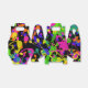 Bold paint splatters in hot pink, yellow, orange, lime green, teal and blue violet dance on a black background.