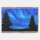 This digital artwork features a display of swirly blue lights in the night sky above the silhouettes of two evergreens.