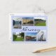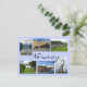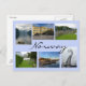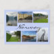 Postcard featuring collage of photos taken in Norway (including Vigeland Sculpture Park, Østbanehallen, a harbour near sunset, a fjord, and a small town church).