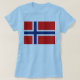 The front of this t-shirt boldly displays the Norwegian flag with its distinctive white fimbriated offset blue cross on a red background. This is matched at the back by an attractive map of Norway.