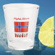 Snow-capped, red lettering, on this shot glass, reads NORWAY underneath this Norwegian Flag with a red background and dark blue Scandinavian, or Nordic, Cross. Above is a place to add your name, in red letters, to personalise your look. Or, add someone else's name for a gift for anyone of Norwegian ancestry. Wonderful housewarming gift for the home bar or stocking stuffer.