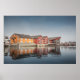 Photograph of traditional red and yellow painted storage buildings at the coast of Lofoten in North Norway, Scandinavia. Photo location: Svolvær, island of Austvågøya.