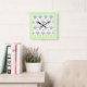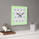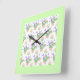 A pretty floral wall clock, with a pattern of pink Roses, creamy white Mock Orange Blossom and purple Lavender, in a light green border, from a handpainted watercolour design by Judy Adamson.