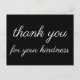 This nostalgic, old fashioned thank-you postcard design features the message "thank you for your kindness" on the front, along with a customised message on the back. It could be used to offer thanks to somebody who has done something nice.
