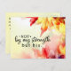 Christian greeting card depicts a simple, minimal fall watercolor with red and yellow autumn leaves. It feature an encouraging inspirational quote taken from Bible Verse Philippians 2:13, "Not by my strength but his." The greeting, prayer can be personalised or deleted for a hand written message.