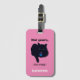 Black cat Cleo on a one-sided pink acrylic luggage tag. Text on front customisable and personalise with your name. Back carries card slot for name address, etc.