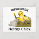 Advertise your mobile notary or loan signing agent business with a touch of humour. Whimsical design features a cute yellow chick surrounded by piles of documents and a bottle of jet blank ink. She's holding a delicate yellow feather quill, over the slogan "Notary Chick." Personalised postcard makes a great gift for any notary professional who provides a valuable service to the public. This notary chick design is suitable for white and light-coloured backgrounds. Customise by changing "Your Name Goes Here" to a name, location, or any other text of your choice. Design tip: For long names you may need to adjust text size down.