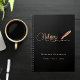 A chic black background, decorated with a feather pen. Personalise and add a name and title. Golden text: Notary