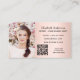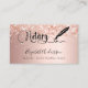 An elegant and glamourous business card on a rose gold faux metallic looking background decorated with faux glitter dust on front and a black signature signing pen. Elegant hand lettered style script. Personalise and add Your name, text, profile photo, contact info and your own QR code to your website address.