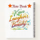 The notebook cover features a whimsical, hand-drawn font that spells out the phrase "Save Earth's Beauty" in a variety of bright colours. The letters are surrounded by colourful floral illustrations, creating a cheerful and inviting design