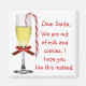 Fun little Christmas magnet, with a note to Santa. A festively decorated wine glass, with red bow on the stem and a candy cane hanging on the edge decorates this fun holiday magnet. A cute note to Santa reads, Dear Santa, We are out of milk and cookies, I hope you like this instead. Personalise if you want the text to say something else.