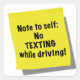 Funny sticky note fot the phone case or the key chain. Text reads, "Note to self: No texting while driving!" Safety warning.