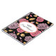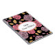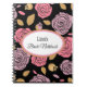 Notebook shown with a graphic of pretty pink roses on a black background with the phrase " Bride Notebook" inside an oval shape with coordinating borders. Customise this item and change the name to yours or take off the name.