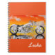 Notebook shown with a photo print of a sharp looking motorcycle and a custom name. Customise this item and change the name to yours or take off the name and buy as is. Stock Image