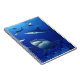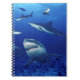Notebook shown with a photo print of sharks in the deep sea. Customise this item or buy as is. Stock Image