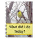 Bird with head turned in questioning manner. Yellow breast and beak stand out amid grey branches and blurry grey sky. Yellow band holds text "What did I do Today?".